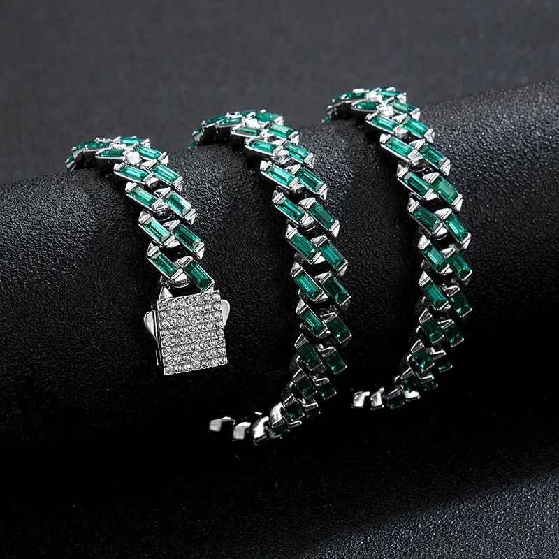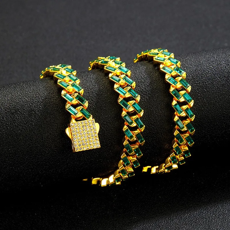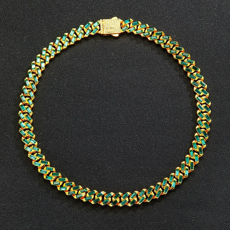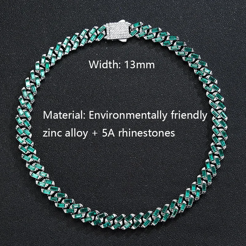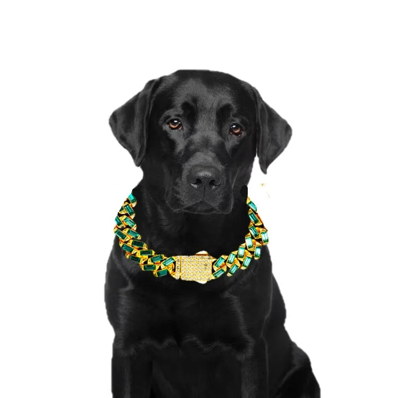 New Dog Collars Bling 13mm Green Stone Diamondd Cuban Chain Cat Necklace Gold Silver Color Pet Jewelry Accessories